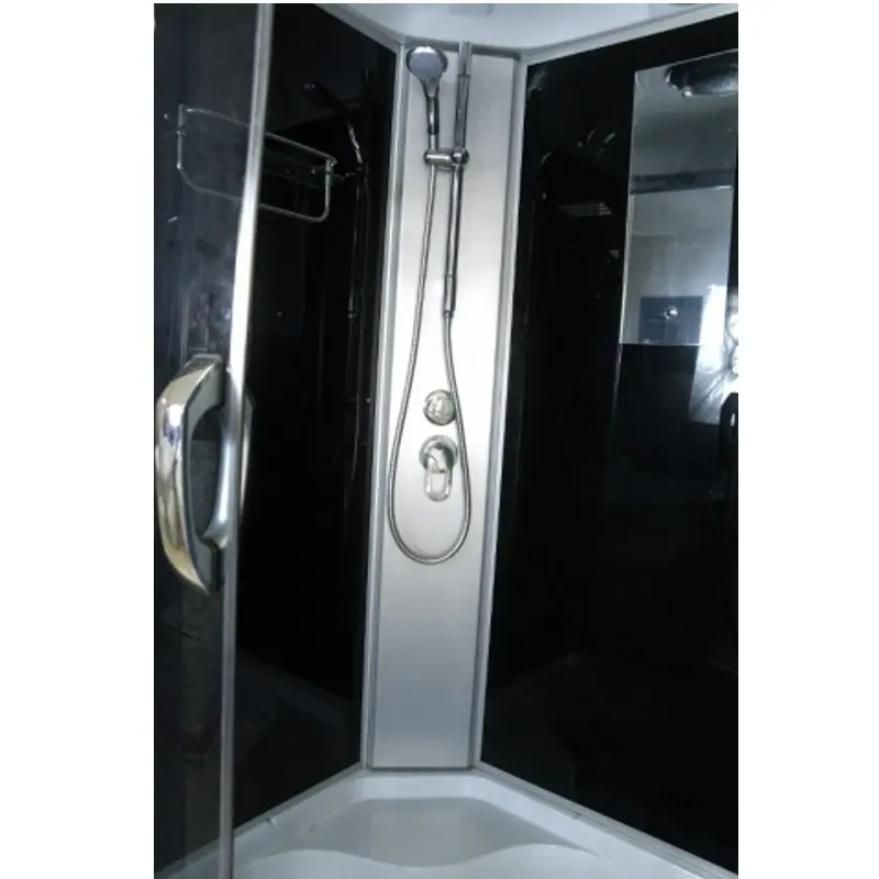 Душевая кабина Водный мир имеет размер 90х90 см. Форма — четверть круга , цвет хром, исполнение полотна двери тонированное. Механизм открывания раздвижной.